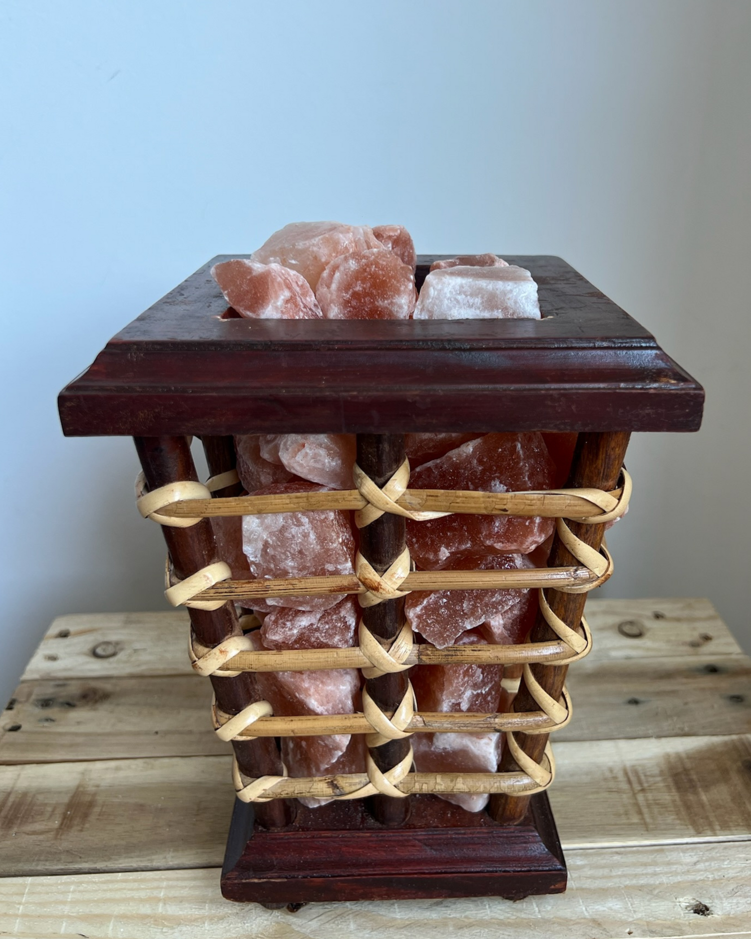 Breng warmte, rust en natuurlijke luchtzuivering in huis met de Himalaya trapeze-vorm houten mand, gevuld met natuurlijke zoutsteenbrokken. Deze stijlvolle mand combineert riet, hout en rustgevende verlichting voor een prachtige aanvulling op elk interieur. Ideaal voor woonkamer, slaapkamer, yogastudio, wellnessruimte of praktijk.